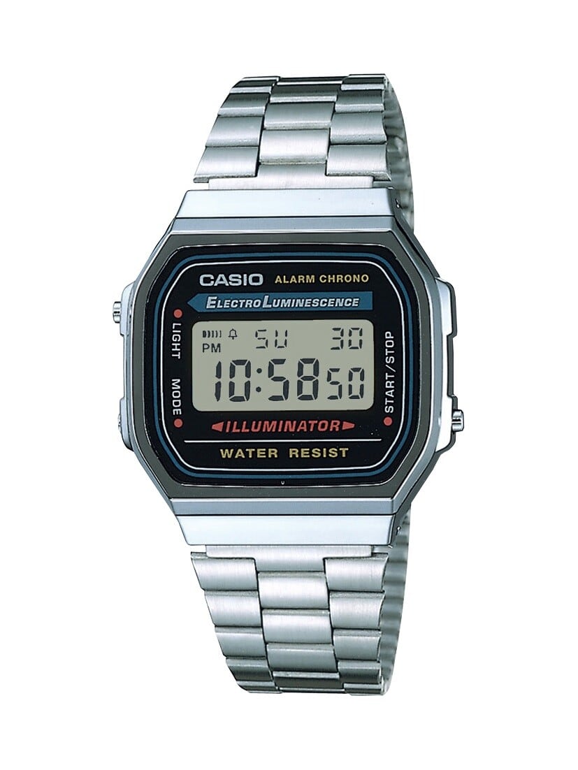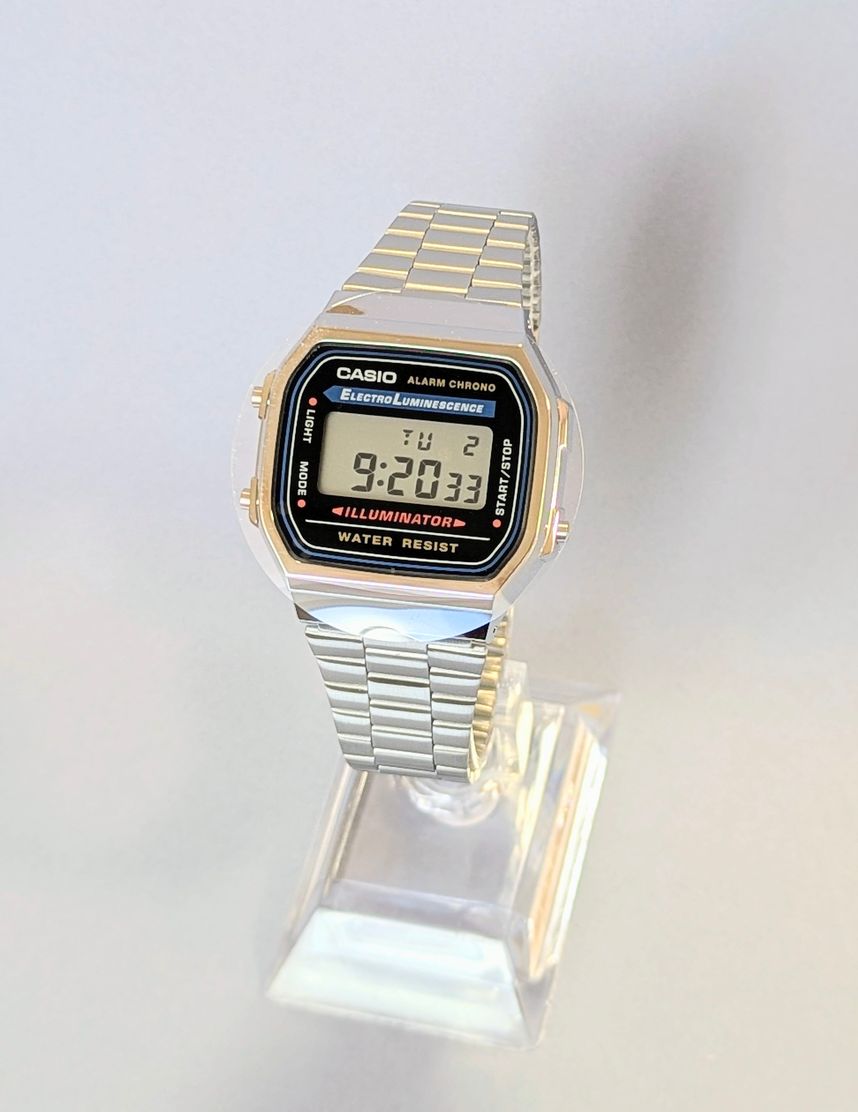 カシオのA168WA-1A2WJRは、レトロな雰囲気のデジタルウォッチの中でも特に人気の高いモデルです。F-91Wなどが「チープカシオ」と呼ばれるのに対し、こちらはメタルバンドを採用しており、より洗練された印象を与えます。