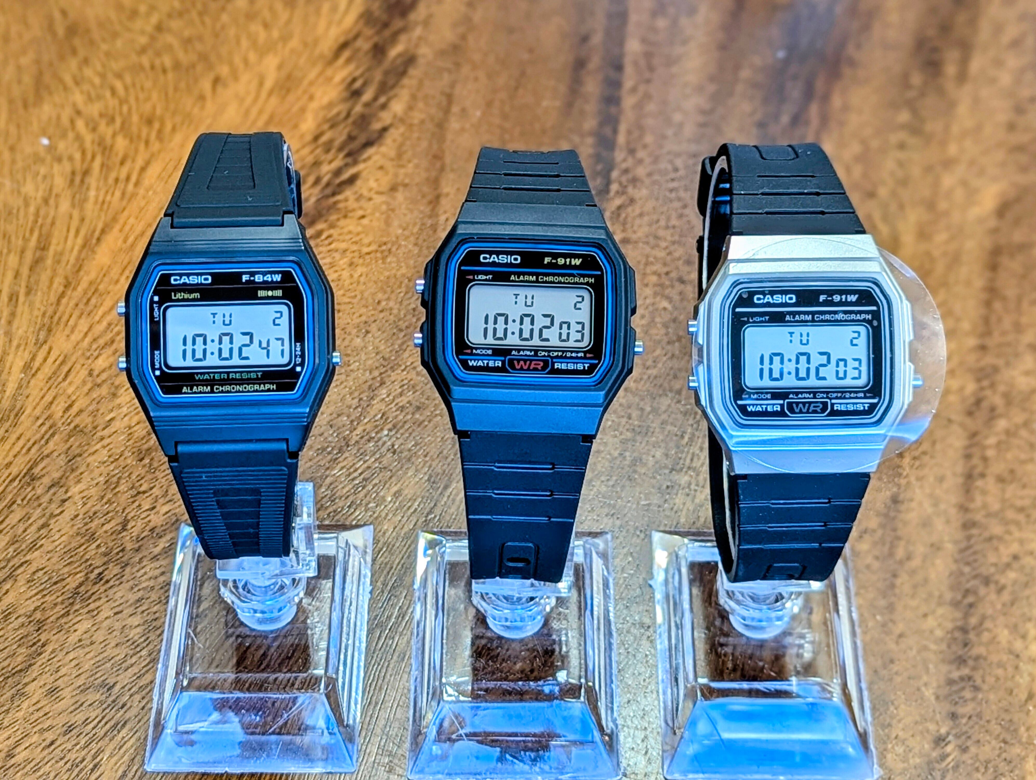 デザイン: F-91Wが角ばったケースデザインなのに対し、F-84Wはより柔らかな曲線を描くケースが特徴です。全体的にすっきりとした印象で、手首に吸い付くようなフィット感が魅力とされています。