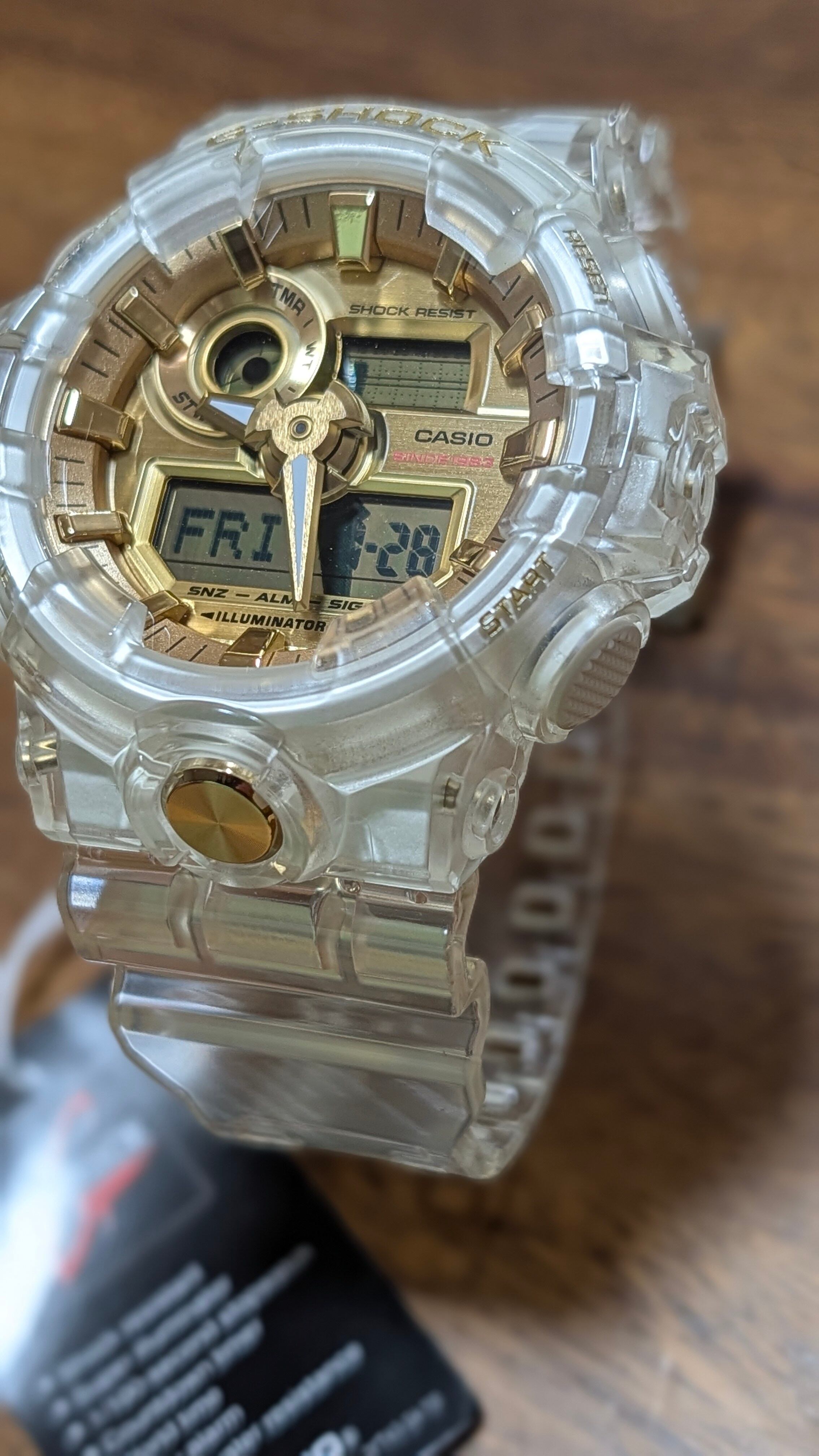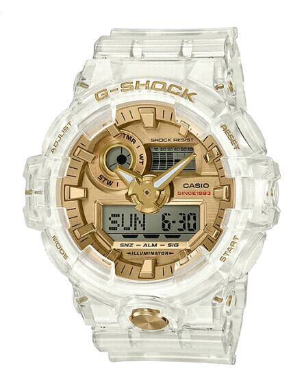 G-SHOCKの誕生35周年を記念して発売された限定モデル「GLACIER GOLD(グレイシアゴールド)」シリーズの一つです。G-SHOCKの歴史の中でも重要なデザインである「スケルトン」を基調に、ゴールドのアクセントを加えることで、特別感を演出しています。